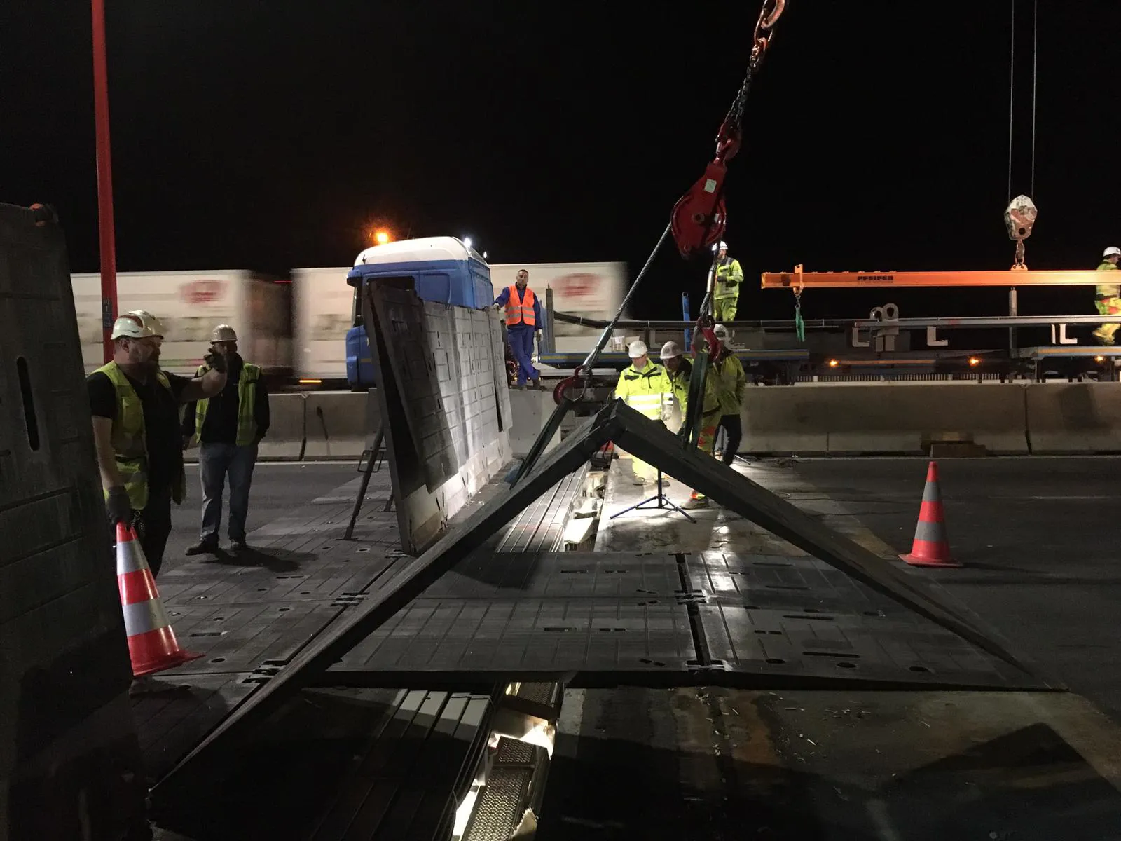 Diese Konstruktion besteht aus drei Stahlplatten, die fahrstreifenweise mittels Ladekran aufgeklappt werden können. Brigitte Müllneritsch, ASFINAG-Regionalleiterin für Wien, erklärt: „Die Funktion ähnelt dem Öffnen einer Zugbrücke. Die Platten sind mit Gelenken miteinander verbunden und dadurch beweglich.“ Anders als beim „großen Bruder“ kann allerdings unterhalb dieser Konstruktion nicht gearbeitet werden. Für die Verkehrsteilnehmerinnen und Verkehrsteilnehmer bedeutet das, dass untertags alle Fahrstreifen befahrbar sind, jedoch nachts teilweise Spursperren notwendig sind.