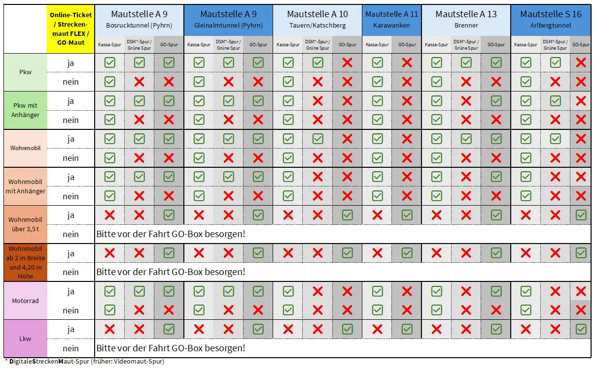 Um auf einen Blick ablesen zu können, mit welchem Fahrzeug man an der jeweiligen Mautstelle welche Spuren benutzen kann, hilft ein Blick auf diese Übersicht: