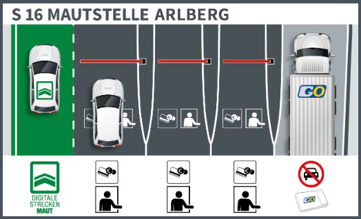 1,5 Kilometer vor der Mautstelle kündigt das erste Schild diese bereits an. Ein weiteres folgt einen Kilometer vor der Mautstelle. Dort angekommen, öffnet sich der sogenannte Mautplatz mit seinen Spuren und die Beschilderung zeigt die Bezeichnung der jeweiligen Spuren an. Nun gibt es grundsätzlich drei Möglichkeiten: