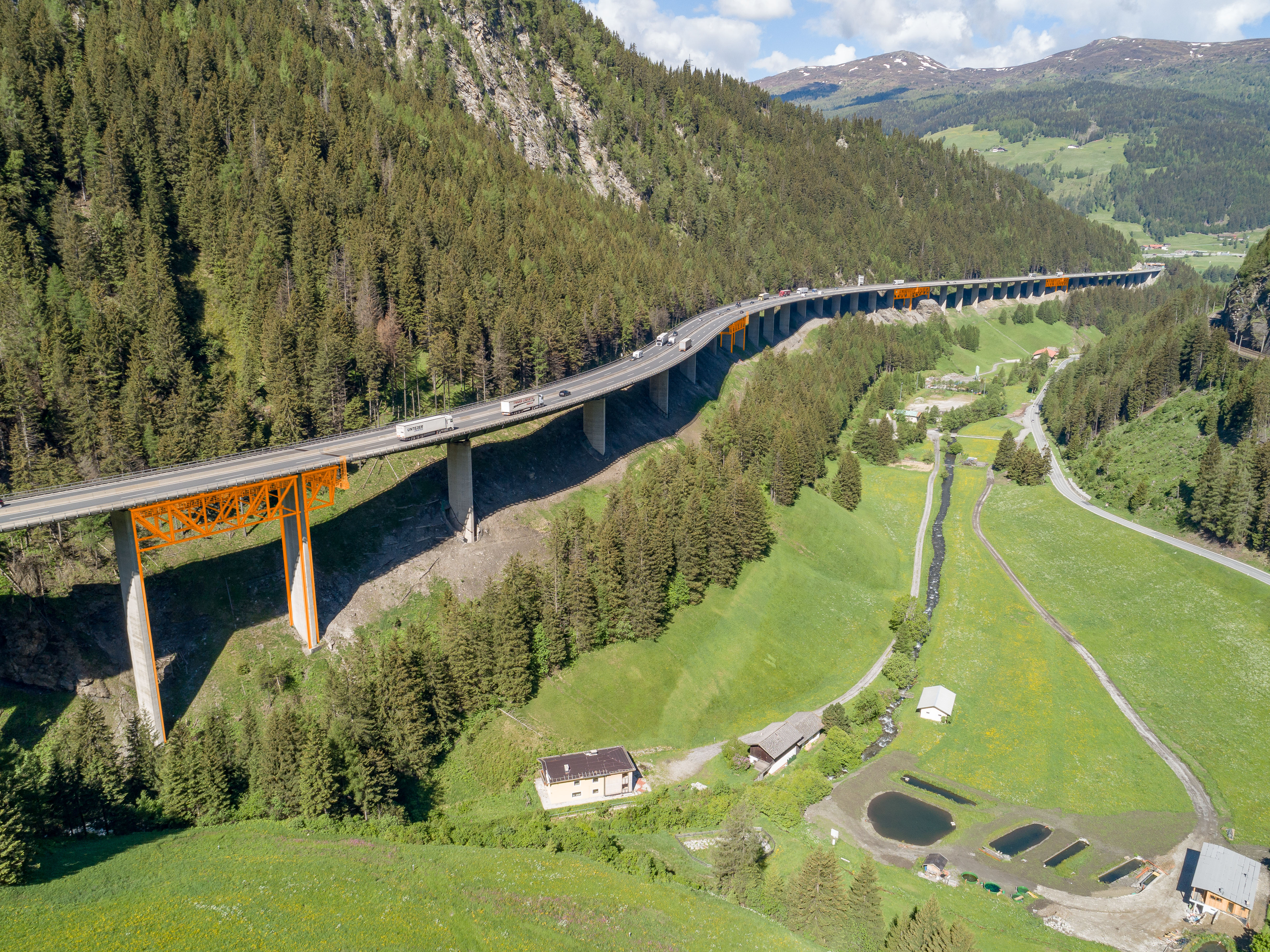 570 Tonnen Stahl werden verbaut, die Träger sind mehr als acht Meter hoch und 35 Meter lang. Vor den Arbeiten wurden über 400 Laufmeter Steinschlagschutz errichtet, um auch für die Arbeiter höchstmögliche Sicherheit zu gewährleisten. Die Luegbrücke ist zudem die längste Autobahnbrücke Österreichs – und das auf der höchstgelegenen Autobahn Europas. Immerhin erreicht die Brennerautobahn gleich nach der Luegbrücke 1.370 Meter Seehöhe.