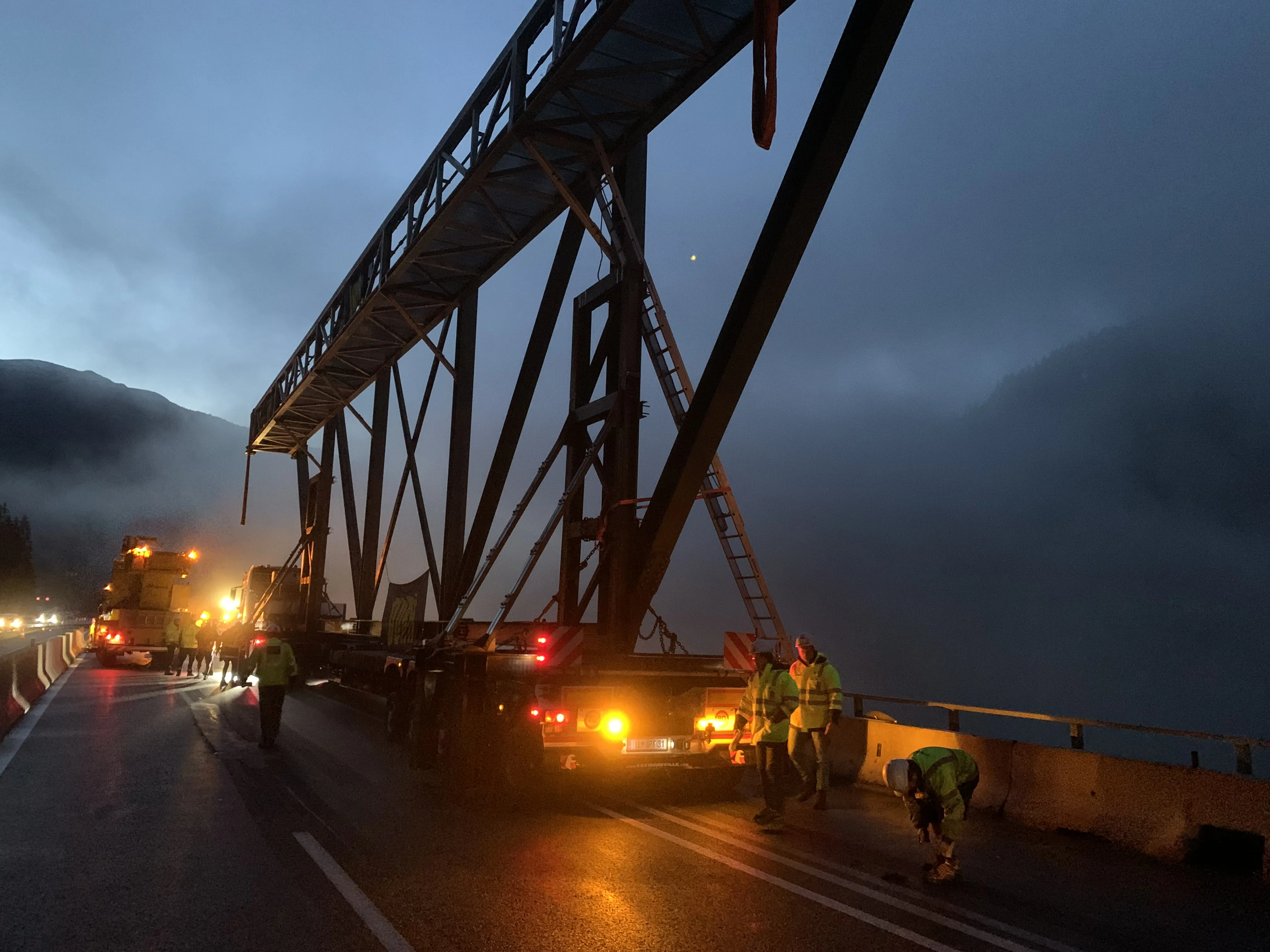 Zwölf Stahlträger mit einem Gewicht von jeweils ca. 35 Tonnen müssen sicher und statisch unbedenklich von der Fahrbahn aus unter die Brücke gehoben werden. Das ist nur möglich mit einem ausgeklügelten Plan, bestmöglicher Vorbereitung und Berechnung sowie einem absolut perfekt eingespielten Team. Die Träger werden auf einem Parkplatz in der Nähe der Luegbrücke vorbereitet und zusammengebaut. Dann muss die Autobahn, meist in den Nachtstunden, gesperrt werden. Der Grund dafür: die 8,5 Meter hohen und 35 Meter langen Träger müssen entgegen der Fahrtrichtung mit Spezialfahrzeugen auf die Brücke gebracht und abgeladen werden. Der Knackpunkt: Dieses Abladen auf die Brücke erfolgt zentimeter-genau auf vorher festgelegte und eingemessene Punkte. Nur so wird sichergestellt, dass das Brückentragwerk nicht überlastet wird. Wenn das geschafft ist, erfolgt der nächste Teil der Choreographie.
