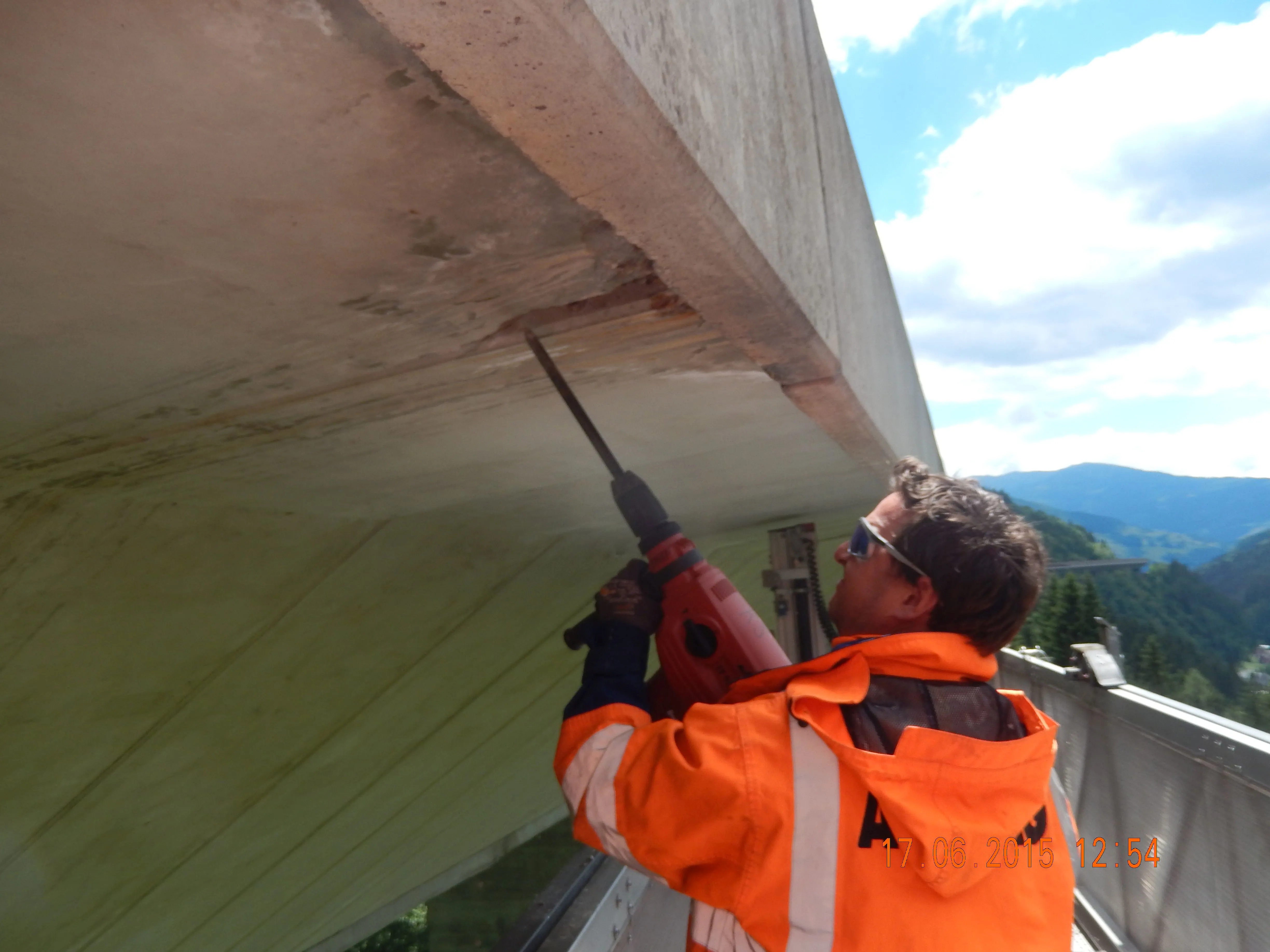 Währenddessen beginnen die Ziviltechniker bereits mit der Tragwerksprüfung. Denn im Sechsjahres-Zyklus werden die Brücken von externen Bauwerksinspektoren auf „Herz und Nieren“ inspiziert. Pfeiler und Tragwerke werden mit dem Hammer abgeklopft und teilweise angebohrt, um das Innenleben des Stahlbetons zu prüfen. Denn: Oftmals ist eine zu geringe Betondeckung das Problem. Diese ist wichtig, um die Bewehrung im Inneren der Brücke zu schützen. Ist zu wenig Beton vorhanden, kann vor allem im Winter salzhaltiges Wasser eindringen und den Betonstahl angreifen, was letztlich zu Rostschäden, oder fachsprachlich ausgedrückt zu „Altersflecken“, führt. Am Ende einer derartigen Prüfung steht ein ausführlicher Bericht inklusive Fotodokumentation. „Die Herausforderung für den Bauwerksprüfer ist es, eine Aussage über die Sanierungsmaßnahme, den Zeitpunkt der Sanierung und die zu erwartenden Kosten abzugeben“, weiß Michael Zehner von unserem Erhaltungsmanagement. Übrigens: Für die Autofahrer:innen bleiben all diese Prüfungen weitgehend verborgen. Nur der gesperrte rechte Fahrstreifen und das Riesen-BIG weisen auf die Arbeit der Techniker:innen hin, die dafür sorgen, dass die Sicherheit für die Verkehrsteilnehmenden gewährleistet ist.