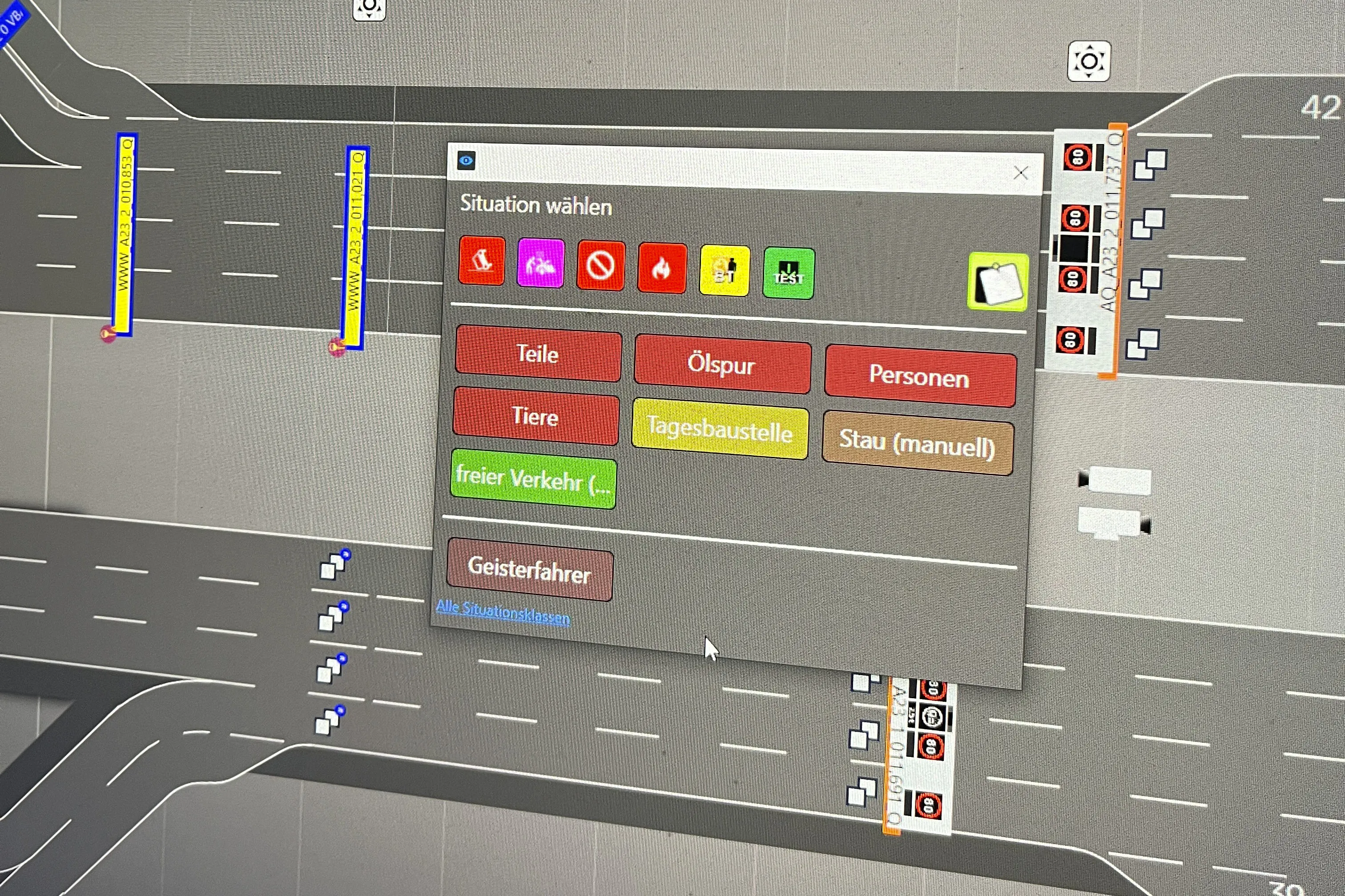 Damit das Fahren auf unserem Netz möglichst sicher ist, gibt es zum einen zahlreiche technische Anlagen rund um unsere Straßen, Tunnel und Brücken, und zum anderen die neun Verkehrsmanagement-Zentralen (VMZ), von denen aus die Operator den Verkehr und die Technik überwachen. Zum Verständnis hier ein Beispiel: In einem Tunnel hat ein Fahrzeug eine Panne und hält in einer Pannenbucht. Die Tunnelsicherheitseinrichtungen registrieren dies, schalten den Tunnel zur Warnung der anderen Fahrenden auf Gelb und zeigen dies in der VMZ sofort an. Das Operating gibt unverzüglich den Kolleginnen und Kollegen auf der Strecke Bescheid, um den Personen bei ihrer Panne zu helfen.