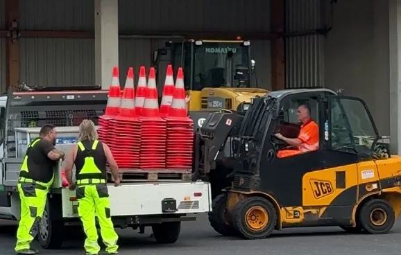 Das Team für diese Schicht besteht aus drei ASFINAG-Mitarbeitenden und drei Mitarbeitenden einer Fachfirma. Zuerst belädt das Team die Ladefläche einer Pritsche mit zahlreichen Baustellenhütchen, mit denen nachher eine Spur gesperrt wird. Außerdem sind zwei sogenannte Abdecker-Lkw mit von der Partie, ausgestattet mit großen LED-Anzeigen, die den anderen Verkehrsteilnehmenden anzeigen, welche Spur gesperrt wird. Und schon geht es los. Die Einrichtung der Absperrung ist der heikelste Moment an diesem Abend und alle sind hochkonzentriert und perfekt aufeinander eingespielt.