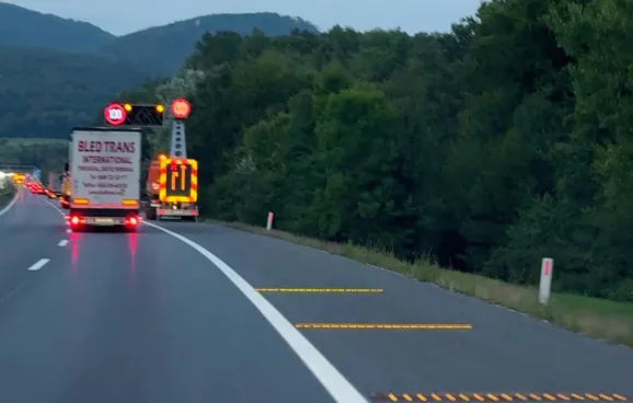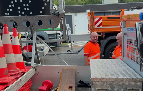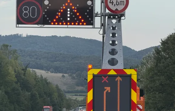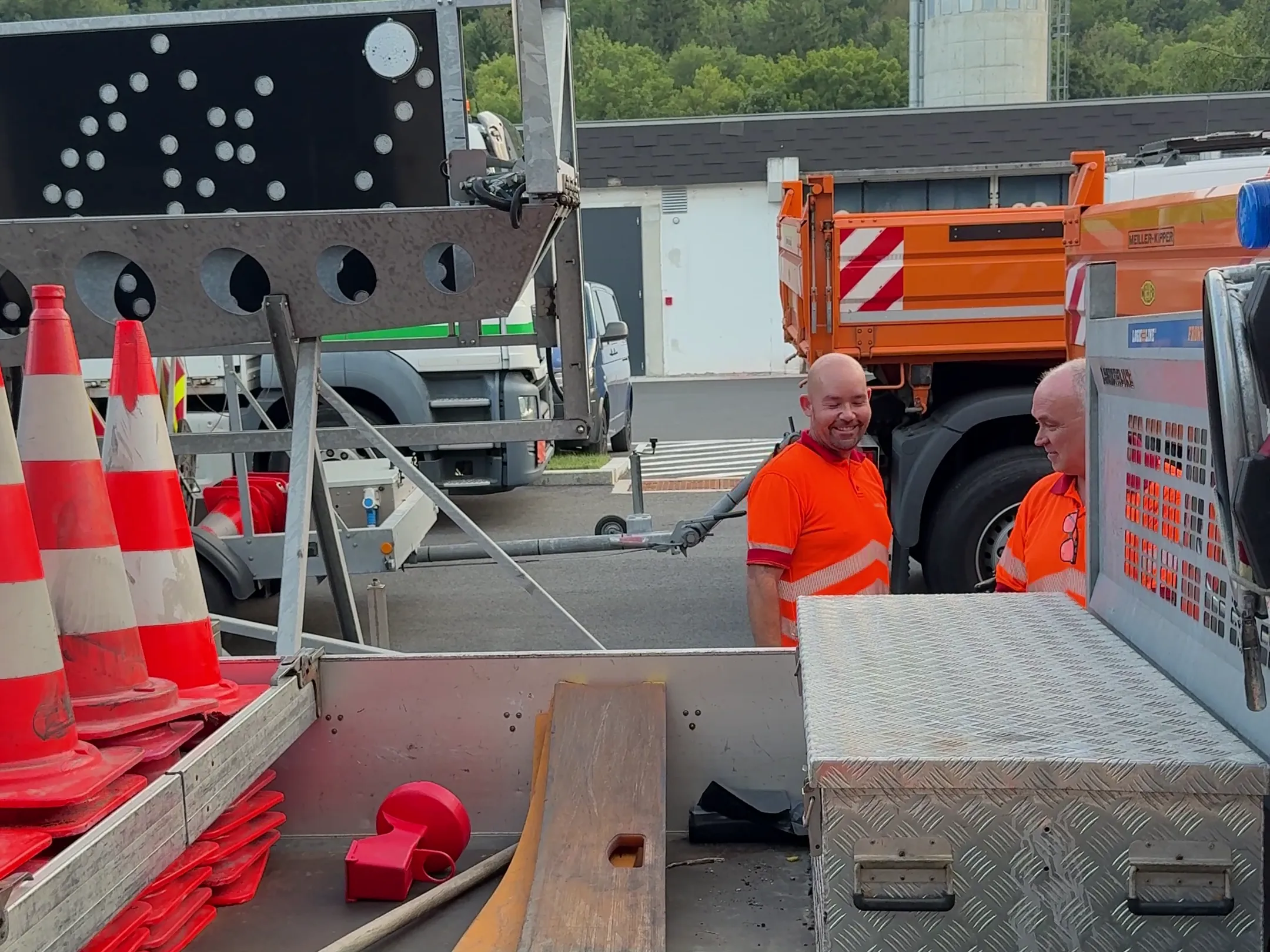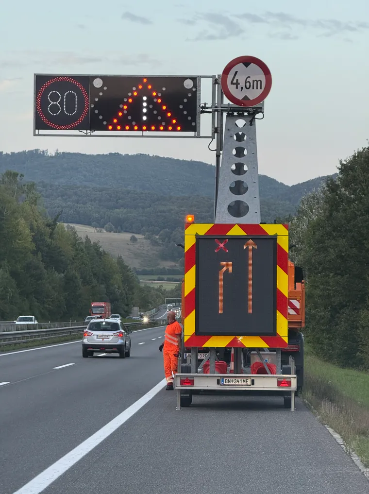 Nun sind die Fahrenden informiert, dass die linke Spur gesperrt wird und dass sie sich in die rechte Fahrspur einreihen sollen. Die maximal erlaubte Geschwindigkeit wird hier auf 100 km/h gesenkt. Ca. 200 Meter danach stellen Sigi und Richard die zweite Anzeige auf, mit dem erneuten Hinweis, sich rechts zuordnen, dieses Mal mit einer Geschwindigkeitsbegrenzung von 80 km/h. „Das Wichtigste beim Arbeiten auf der Autobahn ist, dass man nie den Blick vom Verkehr abwendet“, erklärt Sigi. „Dann kann man im Fall des Falles noch reagieren und zur Seite springen.“