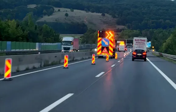 Zuletzt positioniert sich der größte Lkw auf der linken Fahrspur und markiert den Beginn der Absperrung. Zusätzliche Baken mit Reflektoren warnen die Verkehrsteilnehmenden, dass die Überholspur hier spätestens zu verlassen ist.