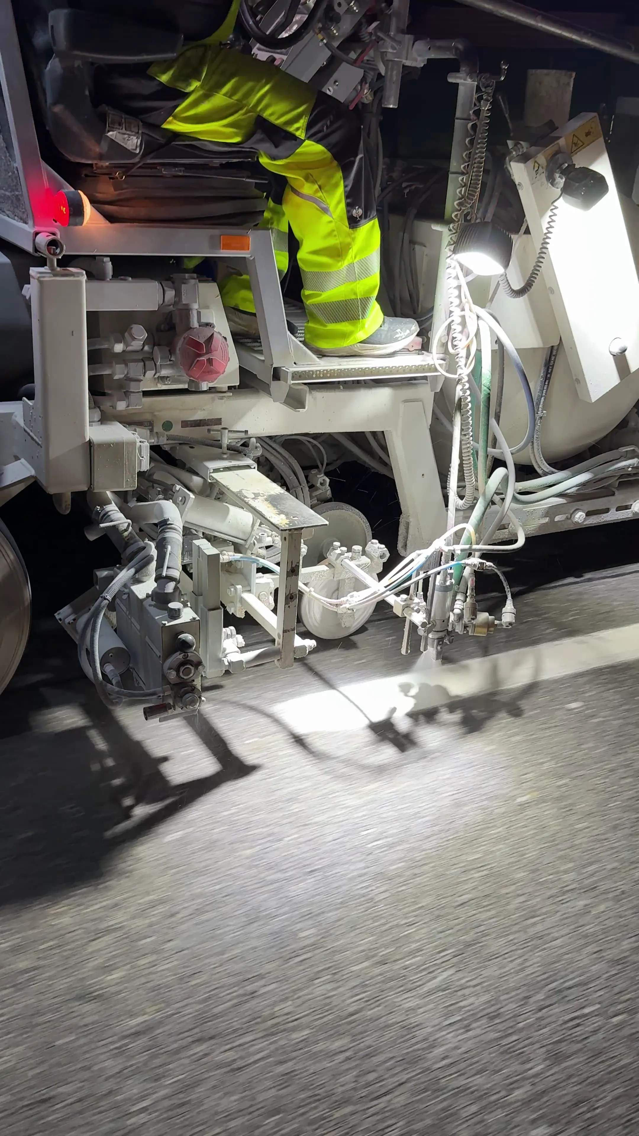 Bernhard, Mitarbeiter der Fachfirma und Fahrer des Markierungsfahrzeugs, hat viele Jahre Erfahrung in seinem Job und strahlt trotz des an ihm vorbeirauschenden Verkehrs absolute Ruhe aus. Er steuert sein Arbeitsgerät zielstrebig mit ca. 8 km/h an der Markierung entlang. Zwischendurch hält er kurz an und überprüft die frische Markierung mit Zollstock und Zeigefinger. „Kaltplastik ist ein 2- oder 3-Komponenten-System, das aus einem Harz (meist Methacrylat), einem Härter und manchmal einem Füllstoff besteht“, erklärt er. „Die Komponenten werden im Fahrzeug gemischt und durch eine Düse aufgetragen. Die chemische Reaktion zwischen Harz und Härter sorgt für eine schnelle Aushärtung.“ Da die Außentemperatur mit 25 Grad in dieser Nacht recht hoch ist, trocknet die Markierung etwa innerhalb von zehn bis fünfzehn Minuten. Wichtig ist, dass die Glasperlen direkt nach dem Auftragen des Markierungsmaterials auf die noch feuchte Oberfläche gestreut werden und dass sie optimal darin haften. Denn stehen sie zu weit heraus, nutzen sie sich schnell ab, und stecken sie zu tief darin, reflektiert die Markierung nicht optimal. Der Fachmann ist zufrieden und setzt seine Fahrt fort.
