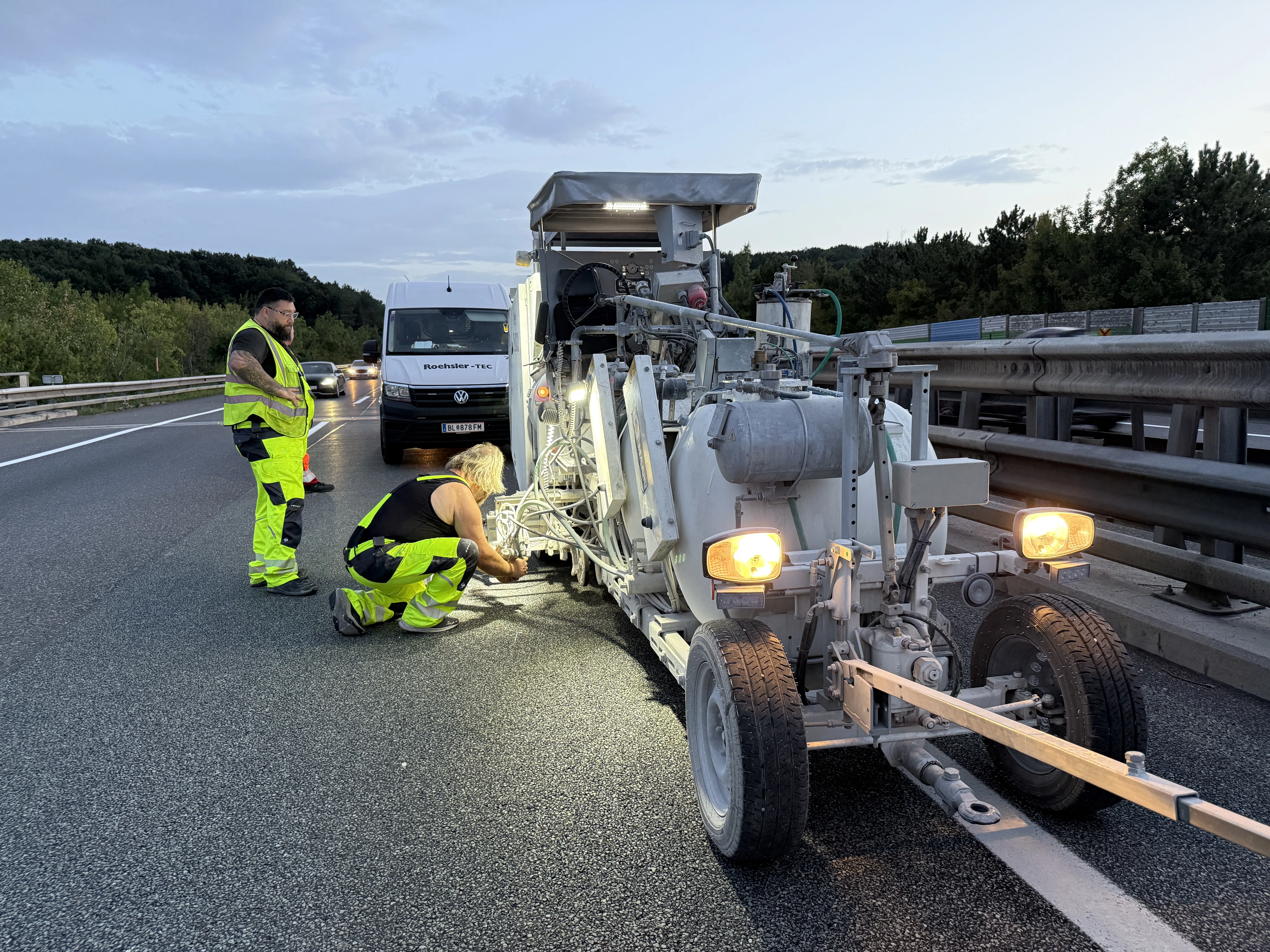 Während Bernhard das Spezialfahrzeug steuert, achtet das ASFINAG-Team auf seine Sicherheit und ist immer wieder mit ihm im Austausch. Außerdem sorgen die drei dafür, dass die aufgestellten Sicherheitshütchen dort bleiben, wo sie aufgestellt wurden, und sie erweitern mit Hilfe des Arbeitskorbs die Absperrung bis zum Ende des festgelegten Abschnitts. Und während wir nach unseren Aufnahmen den Heimweg antreten, werden die Kollegen noch bis zum Morgengrauen unterwegs sein, um die zwölf Kilometer lange Markierung pünktlich zum Berufsverkehr fertigzustellen.