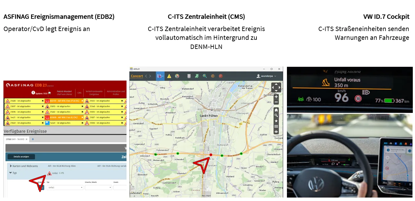 Die Gefahrenwarnungen werden zentral in der Ereignisdatenbank der ASFINAG durch den Operator/die Operatorin der jeweiligen Verkehrsmanagementzentrale erfasst. C-ITS läuft vollautomatisch im Hintergrund ab. Wird ein neues Ereignis erfasst, wird das Ereignis in die entsprechende C-ITS Warnung übersetzt und an die umliegenden Straßeneinheiten verteilt. Vorbeifahrende Fahrzeuge „sammeln“ diese Warnungen auf und zeigen sie bei Bedarf an.