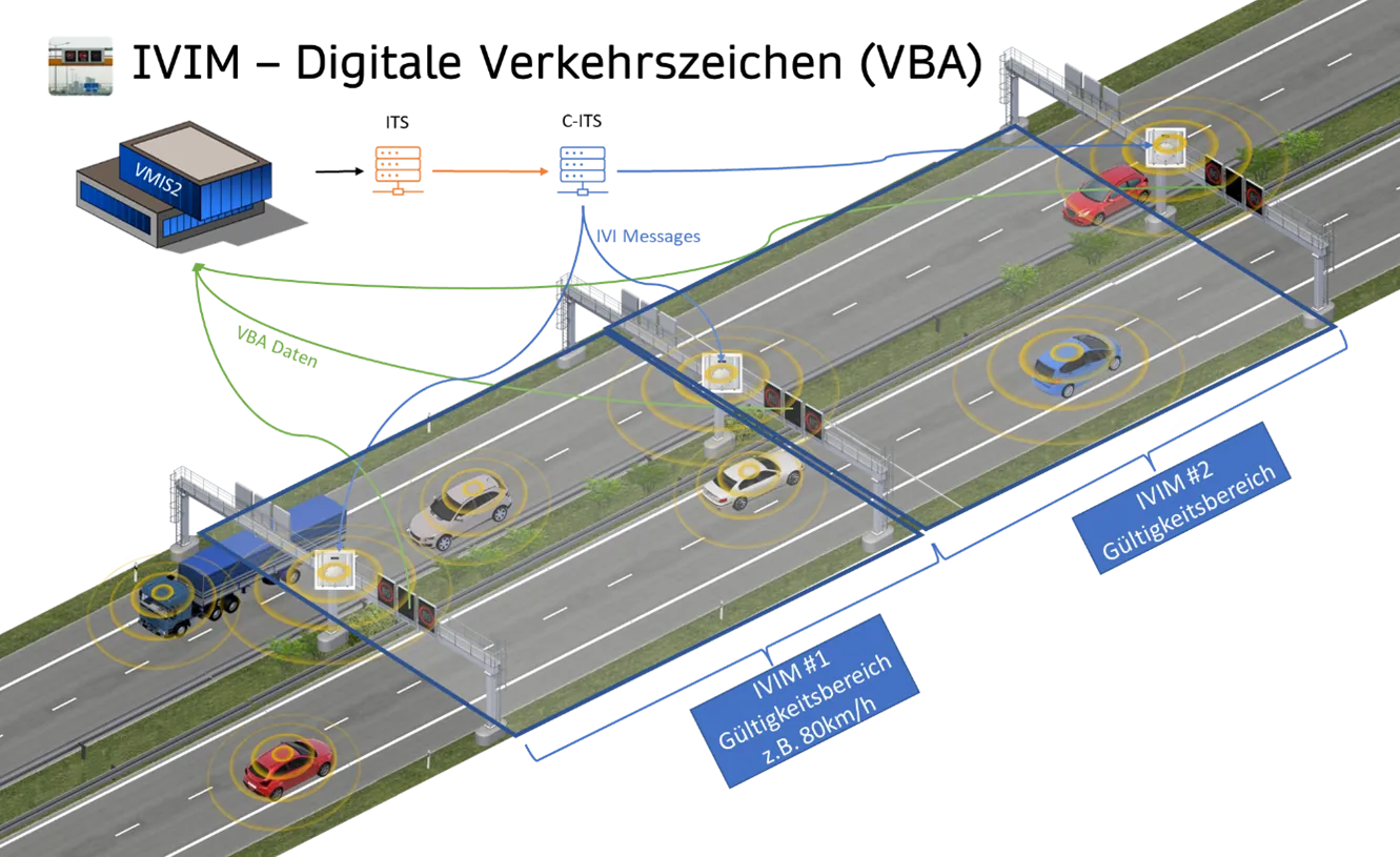 Ein weiterer Anwendungsfall ist das direkte Anzeigen von Informationen von Überkopfschildern – wie etwa dynamischen Geschwindigkeitsbeschränkungen. Konventionelle Systeme bauen hier auf optische Erkennung und sind nicht so verlässlich. C-ITS stellt die Information korrekt und in Echtzeit dar – und liefert die Information direkt ins Auto.
