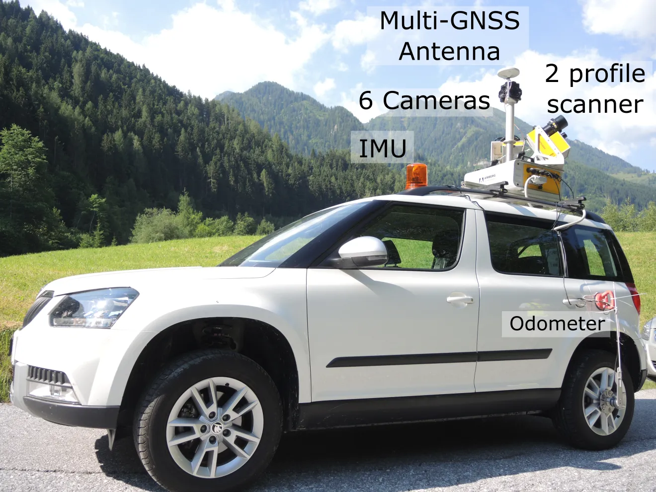 Unsere grundlegende Idee ist es, Daten über das Stützbauwerk aus einem vorbeifahrenden Auto, das sich dem Verkehr nahezu anpasst, zu erfassen. Auf dem Dach des Autos befindet sich ein kommerziell erhältliches Mobile Mapping System (MMS https://de.wikipedia.org/wiki/Mobile_Mapping). Derartige Systeme bestehen aus: