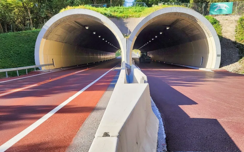 Mit einer roten Asphalt-Farbe reduziert die ASFINAG den Energieverbrauch deutlich, nämlich um knapp 30 Prozent in der Simmeringgalerie auf der Inntalautobahn. Gleichzeitig erhöht sich durch die rote Farbe das Aufmerksamkeits- und Sicherheitsgefühl der Verkehrsteilnehmenden. Da eine rötliche Fläche Licht stärker reflektiert als die gewohnte dunkelgraue Fahrbahnfarbe, ist es in Galerien und vor allem in Tunneln etwas heller und damit ist weniger künstliche Beleuchtung notwendig, was die Energiekosten sinken lässt. Das gilt vor allem dann, wenn neu asphaltiert wird.
