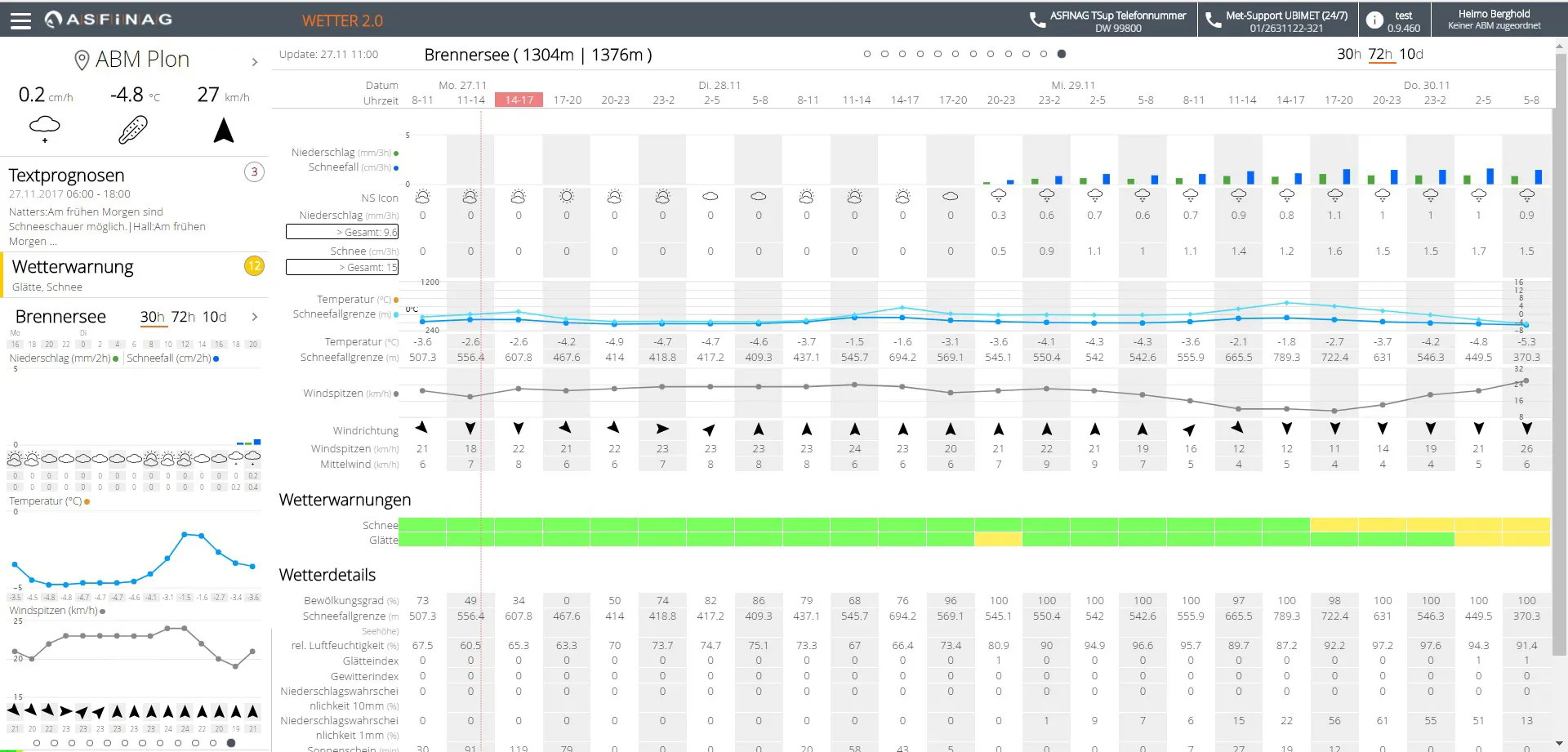 Unser wichtigstes Arbeitstool im Winter: das Wetter-Prognose-System. Ohne das geht’s nicht. Es ist das Um und Auf für die Einsatzplanung. Die Herausforderung für uns: Jede Region hat ihre ganz speziellen Eigenheiten. Deshalb kann unser Wettersystem für 240 sogenannte Mikroklimaabschnitte eine ganz individuelle Detailprognose erstellen. Es wirft für unsere 43 Autobahnmeistereien wichtige Wetterdaten wie zum Beispiel Temperatur und Niederschlagsart, Schneefallgrenzen und Windgeschwindigkeiten aus. Aber auch Satellitenbilder, Blitzaktivitäten und Fahrbahntemperaturen oder Restsalzgehalte der Fahrbahnoberflächen können damit abgerufen werden.