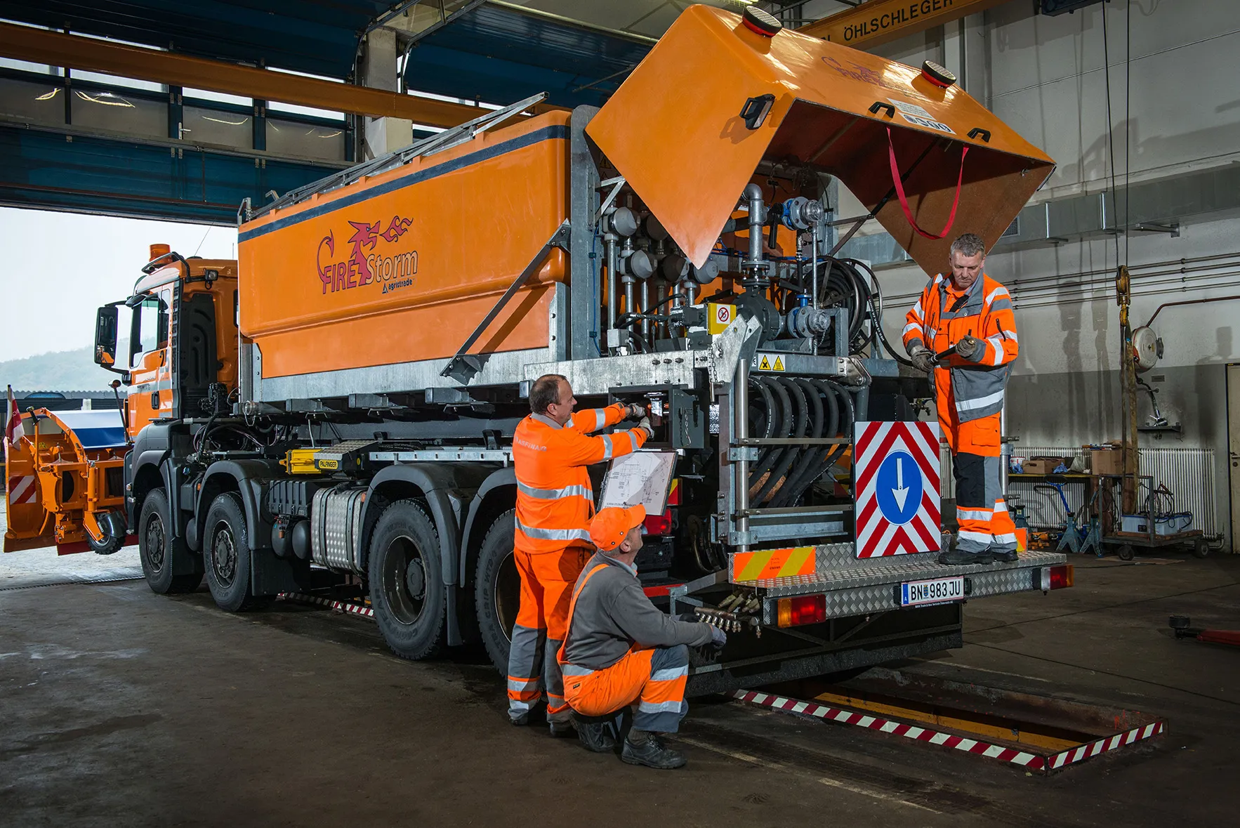 Auch auf der Straße setzen wir auf Innovationen. Diese reichen vom Fire Storm über Kombi-Streuer, die wahlweise Salz oder Sole streuen können, bis hin zu überbreiten Pflügen. Der „Drache“ der Autobahn, der Fire Storm, ist unser Helfer für Lkw-Fahrer. Seine wichtige Aufgabe: Anfahrtshilfe für Lkws. Mit dem Fire Storm sprühen wir heiße Sole direkt unter das Fahrzeug. Die Sole schmilzt den Schneebelag, so dass die Reifen – sofern es Winterreifen sind – wieder greifen und der Lkw weiterfahren kann. Da wir für den „Autobahndrachen“ jedoch ein spezielles Streugut sowie eigene Ladevorrichtungen und Lagertanks brauchen, kommt er nur auf sehr exponierten Strecken zum Einsatz. Zwei dieser Spezialfahrzeuge sind bei uns im Einsatz: Eines auf der A 21 Außenring Autobahn nahe Wien und eines auf der A 10 Tauern Autobahn zwischen Zederhaus und Flachauwinkel.