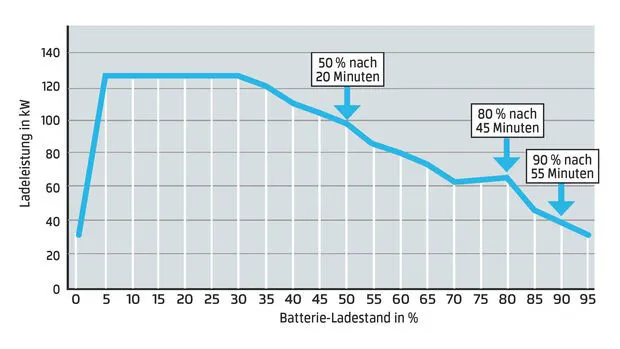 Ladekurve: Jetzt wird es ein wenig kompliziert! Aber die Ladekurve ist sehr wichtig um zu verstehen, warum die Ladezeit bei E-Fahrzeugen nicht immer gleich ist. Die Ladekurve beschreibt nämlich den Verlauf der Stromaufnahme während eines Ladevorgangs. Dabei zeigt sich, dass die Stromaufnahme mit zunehmender Ladedauer abnimmt, weil jede einzelne Batteriezelle im Fahrzeug möglichst gleich geladen sein sollte. Dieser Ausgleichsvorgang ist nur mit niedrigeren Ladeleistungen möglich und dauert entsprechend lang, da mehrere tausend solcher Zellen in einem E-Pkw verbaut sind. Zur Veranschaulichung wollen wir Batteriezellen mit Sektgläsern vergleichen: Wenn ein Kellner viele Sektgläser gleichzeitig servieren muss, wird er zunächst mit der Sektflasche großzügig alle Gläser befüllen. Damit aber jedes Glas exakt gleich gefüllt ist, kann der Kellner immer nur sehr geringe Mengen an Sekt in die einzelnen Gläser füllen. Und das braucht eben Zeit! Nun aber wieder zurück zur Technik. Die Ladekurve hängt grundsätzlich von der elektrotechnischen Architektur des Fahrzeuges ab. In der Praxis gibt es aber noch andere Faktoren, welche die tatsächliche Ladekurve beeinflussen: Die zur Verfügung gestellte Anschlussleistung, der aktuelle Ladezustand der Batterie, die Temperatur, aber auch das Alter der Batterie. Wir sehen also, der Ladevorgang ist mit dem herkömmlichen Befüllen eines Tanks nicht wirklich vergleichbar. Daher eine Empfehlung: Bevor man sich ein E-Fahrzeug kauft, sollte man sich die Ladekurven der Fahrzeuge ansehen, denn da lässt sich ablesen, wie effizient das Fahrzeug wirklich geladen werden kann.