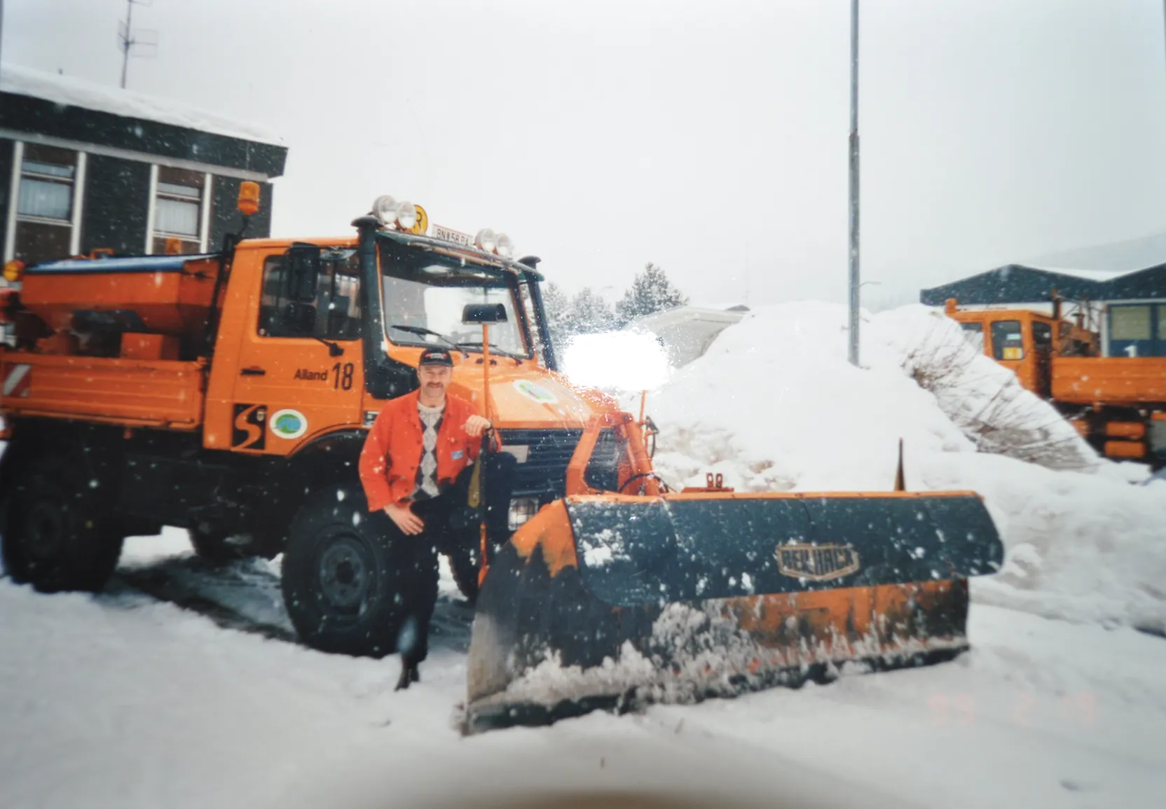 Transportiert wurde der aber nicht am Räumfahrzeug, sondern mit separaten Autos. „Die sind extra angefordert und bei uns beladen worden. Erst danach ging es auf die Strecke. Auf der Schneefahrbahn war der Split perfekt, ihn später wieder zusammenzukehren war weniger lustig“, erinnert sich Josef Kummer. Damals fuhr man nicht so wie heute sofort hinaus, also lag nicht nur bereits viel Schnee auf der Fahrbahn, sondern der war auch festgefahren. Um den Schnee wieder wegzubekommen, waren an der Unterseite der Frontpflüge viereckige Messer befestigt. „Keine Ökoräumleiste wie heute“, lacht Anton Vogel, „sondern große, nach vorne gebogene Messer, die den Schnee richtig von der Fahrbahn geschert haben. Die waren so unvorteilhaft montiert, dass wir vor Fahrbahnübergängen stehen bleiben mussten, um den Pflug zu heben. Sonst wären wir hängen geblieben.“