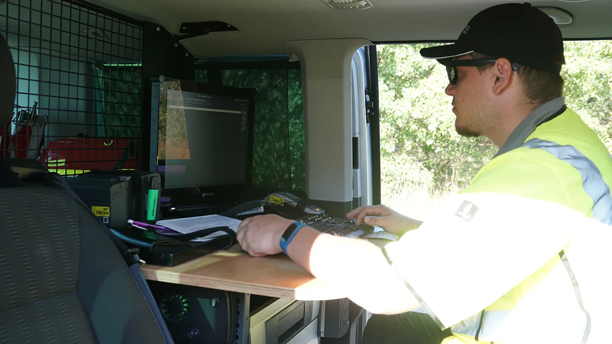 Auf meinem Tablet tauchte der erste Lkw mit fehlerhafter Go-Box auf. Es wurde spannend! Ich durfte Paul den Weg ansagen, indem ich mithilfe von Michael und den Koordinaten die Fahrzeit des herankommenden Lkws berechnete. Der Lkw war nur noch einige Sekunden entfernt, wir warteten auf ihn am Pannenstreifen. Wir überprüften das Kennzeichen, fuhren dann auf die Fahrbahn und überholten ihn. Ich durfte die LED-Tafeln einschalten, auf denen für den Lkw-Fahrer zu lesen ist: BITTE FOLGEN. Wir wiesen ihn zu einem nächstgelegenen Parkplatz.
