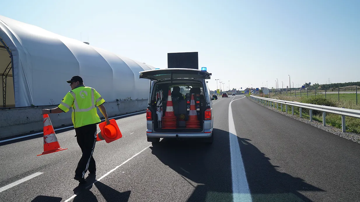 Auf der Autobahn angekommen, stellten wir die Fahrzeuge mit großem Abstand voneinander am rechten der beiden Fahrbahnstreifen ab und sperrten diesen für die Vignettenkontrolle. Ich wurde in die Sicherheitsvorkehrungen eingewiesen. Zwei große LED-Anzeigen am Fahrzeugdach, sogenannte Early-Warner, wurden eingeschalten. Mit Pfeilen weisen sie auf das Befahren des linken Fahrstreifens hin. Pylone und Warndreiecke erhöhen die Sichtbarkeit. „Sicherheit hat immer oberste Priorität – man darf nie vergessen, dass man auf einer Autobahn unterwegs ist!“ erzählte mir Gerhard. Weitere Pylone verschmälern den linken Fahrstreifen, um die Geschwindigkeit der Durchfahrenden zu minimieren. Nach dem zweiten Einsatzfahrzeug gibt es eine Haltemöglichkeit. Diese wird genutzt, um bei Auffälligkeiten die Vignette genauer zu überprüfen ohne den Verkehr aufzuhalten.
